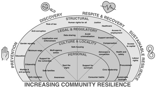 8]. For example, such assets might include spot-the-signs training at a personal level to aid in the discovery of victims; at the locality level, the availability of safe and suitable housing to provide respite, and at the regulatory level, the legal mandate to provide victims with adequate physical and psychological health support.