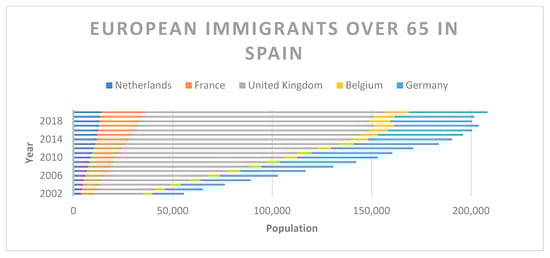Almost 20 years ago, Warnes and colleagues stated that “the number of older migrants in Europe (and other developed world regions) will grow substantially during the coming half-century” [] (p. 308). The forecast has come true, as international retirement migration (IRM) has increased enormously since the 1990s and now involves millions of elderly Europeans. Figure 1 shows the evolution of registered residents in Spain, over 65 years old, coming from five key origin countries. In less than twenty years, elderly residents from the Netherlands, France, UK, Belgium, and Germany increased by 300%, reaching more than 200,000 persons in 2020. Recall that all previous studies indicate that many EU elderly living in Spain never register as residents, and that registration has to be multiplied by 3 or even by 5 to get a glimpse of the real numbers [,]. Duran finds evidence that the British community tends to register more than the German, but we do not have a clear picture of which nationalities are more or less underrepresented in local population registers [].