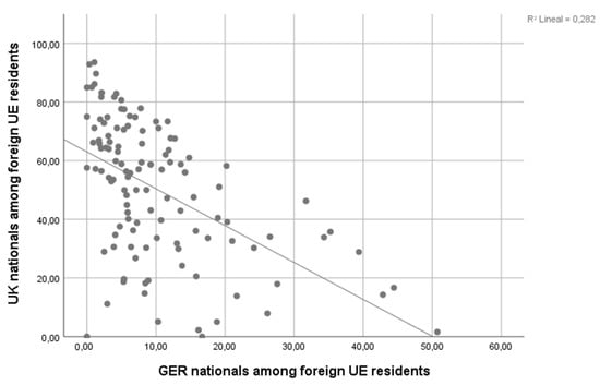 Figure 2. Spatial concentration by nationality. Each dot is a municipality. In the horizontal axis one can see the share of German nationals among all foreign residents of 65 years old and more. In the vertical axis one can see the share of UK nationals among all foreign residents of 65 years old and more. The line is the regression line for a linear regression model with the two variables. Source: Own elaboration with Local Register data.