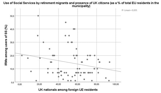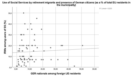 Our second hypothesis stated that UK elderly citizens living in Spain use Spanish Social Services relatively more than German elderly citizens living in Spain. According to the phone interviews with coordinators of Social Services, in almost all municipalities, UK retirement migrants were the main group of elderly Europeans using the Social Services. This does not mean that the UK elderly massively approach local Social Services. We already said that under-use is the pattern across all municipalities. However, even if only a few do use local Social Services, the British are always among them. This is not surprising, because UK citizens are the largest group of elderly foreigners in Spain (Figure 1), and its superior presence among users of Social Services can just reflect its higher number. To evaluate if UK citizens tend to use local Social Services more than German citizens, we need to see if municipalities with a high share of UK citizens among its residents are characterized by a high presence of UK seniors among claimants of Social Services.