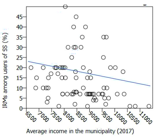 Use of Social Services by retirement migrants and average income of the municipality. Each dot is a municipality. The line is the regression line for a linear regression model with the two variables.