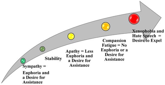 After the Syrian refugees received sympathy and were welcomed with euphoria and a desire to be assisted, especially after the publishing of the Aylan Kurdi photo, negative representation started to appear in some host countries’ media and circulated in social media. The repeated publishing of negative representations of the Syrian refugees contributed to making compassion less towards refugees and thus forming compassion fatigue towards those refugees in host countries [60]. As a result, it contributes to incitement against the refugees and calls to expel them. It is concluded from the discussion, e.g., (Extract 38), that the participants see that negative representation could be a reason for converting the citizens’ feelings towards the refugees from sympathy into xenophobia passing by apathy and compassion fatigue towards the refugees as is concluded in Figure 1 below.