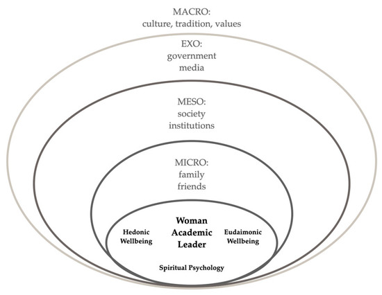 To understand contextual dimensions of wellbeing, development, and leadership amongst urban, Saudi academic leaders, we constructed an integrated conceptual framework of subjective as hedonic wellbeing [9] and psychological as eudaimonic wellbeing [10,11], framed by Bronfenbrenner’s bioecological model of human development [12,13], including sensitizing concepts from the psychology of religion literature [14,15]. This conceptual framework (see Figure 1) enabled the examination of wellbeing within nested contexts of development and relationships between them and helped make visible “interactions between organism and environment that drive the process of development” [13] (p. 813). Instead of taking a reductionistic view of adults as “static, non-developmental organisms” [16] (p. 69), we took a multifaceted, ecological, lifespan-developmental perspective of the human being as a dynamic, developing person, in interaction with other people and processes and situated within a dynamic, developing society [12]. Understanding individuals as developing within situated contexts shaped the study’s methodology and analytic approach. Centering a woman’s descriptions of her own wellbeing within a unique sociocultural context, considered on various ecological levels from the proximal to the distal, enabled us to focus analytic attention on whole human wellness within contexts shaping ontogenic development.