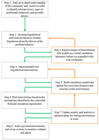 Starting with the 5-step Battista process for implementing the intervention, the ABM supplementation adds three more steps (3, 5, and 7) to the process. Step 1 aims to gain an in-depth understanding of the community and context to identify relevant actors, types of problematic behaviors, and possible drivers. Step 2 is to develop hypothetical interventions based on testable hypotheses about the drivers of the problem behavior. The theories and hypotheses should formalize the relation between the expected behavior, including contextual factors and the individual circumstances of those displaying the problem behavior. Step 3, the first instance of the ABM -enhanced process, is to build simulation models that capture the ecosystem dynamics and structure of the interventions. Research and data gathering as part of ABM development will enhance the learning from Steps 1 and 2. Step 4 is to experimentally test hypothetical interventions on populations resembling the target population, using artefactual field experiments and additional simulated experiments to test hypotheses developed in Step 2. Step 5, the second ABM addition, explores the impact of interventions with models in a virtual simulation laboratory before (or in parallel with) a real-world pilot. Step 6 pilots interventions based on the mechanisms identified in the controlled field and simulation experiments. Step 7, the final ABM step addition, is to update models and analysis to optimize plans for testing interventions at scale. The final step, Step 8, is to scale-up tested interventions and set up systems to monitor, evaluate, and adjust to fit different contexts for retesting.