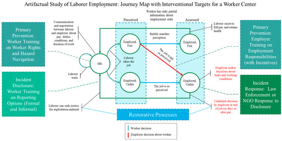 The current study draws from our artifactual study of day laborers (Steps 1 and 2) to develop an ABM sufficient to examine various interventional candidates in a virtual environment (Step 3) before conducting pilot studies (Step 4) or RCTs at-scale in the field (Step 6). Figure 3 displays the translation of the day laborer journey map of Figure 2 into a multi-agent, state, and decision diagram that we implemented as an ABM. In our model, there are agent classes for (1) laborers, (2) employers, and (3) interventions. While all three are dynamic objects created in the model that are endowed with data properties and computational functionality, the first two are the human participants in our system. The intervention agent could be a human (advocate) or control policies (PSA) to be added to the model.