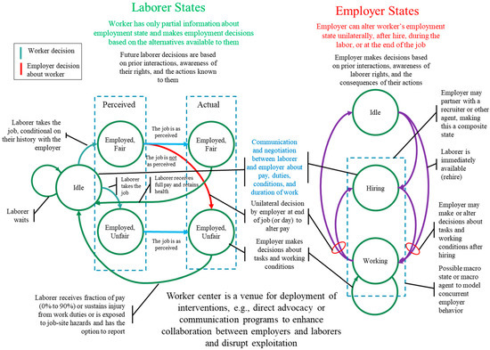 Relationship between Labor and Employer State & Decision Spaces. Figure 3 displays the decision-making process associated with the day laborer journey of Figure 2, now identifying the agent classes, the states for those agent classes, and the possible transitions, both controlled and uncontrolled, that are incorporated in the ABM developed from the case study.