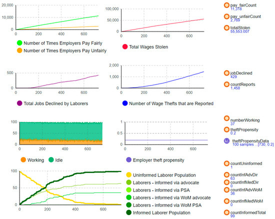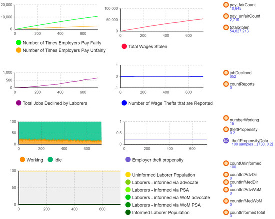 Mirroring our observations in the real system, the employer makes a decision about stealing the laborer’s wage at the time the job is over and it is time to pay and move into the ‘Paid’ state. Literature and past interviews have revealed that the more dire the employer’s economic situation is, the more likely they are to steal; on the other side, the more dire the economic situation is of the Laborer, the more likely they are to report. Technically, a job is created with the capacity to store a ‘fairness’ calculation. The value from this calculation determines whether the job will be fair—the actual amount paid out to the worker matches the perceived pay amount- and this calculation is only revealed after the job is complete. The agents’ response depends on the socioeconomic characteristics drawn from literature and interview data.