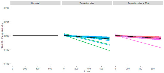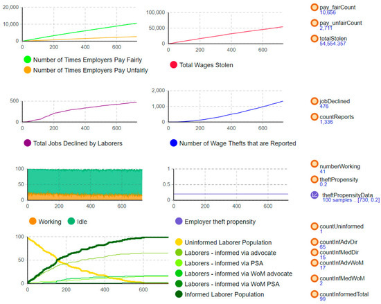Laborers become informed about their rights and options as they receive repeated messages (from advocates, media campaigns, or other workers). A report made by the laborer affects the employer’s future behavior. As their inclination to report goes up, the penalty for the employer goes up, and hence the overall wage theft goes down. This feedback loop is governed by the employer’s theft propensity variable.