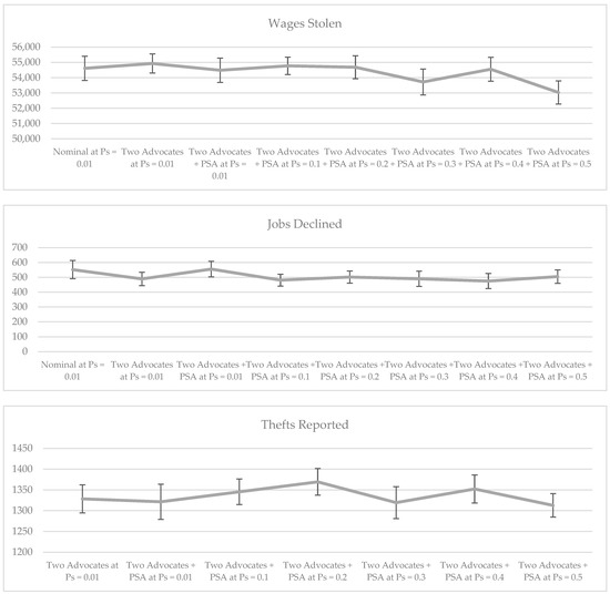 Employer Theft Propensity: We assume based on qualitative insight from our empirical research that day laborers’ specific actions like reporting wage theft will reduce an employer’s future propensity for theft. Specifically, in the ABM, reporting wage theft incurs a penalty for the employer. Once the employer is reported, the propensity for future theft is lowered. As more reports occur, the employer is less likely to commit wage theft, eventually tending to zero. The degree of decreased theft propensity depends on the effectiveness of reporting and the associated penalty. The likelihood of the reporting success will determine if the employer returns the stolen wages to the laborer. Additionally, if a successful report also includes punitive damages, then the future theft propensity on the side of the employer is calculated through the total funds subtracted by the sum of total stolen wages and an additional penalty, divided by the total funds. The resulting amount is how much ‘punishment’ the employer will endure if wage theft is reported. In the current ABM, future theft propensity for an employer agent e is adjusted through a scaling factor, Θe,p that is in the range 0 to 1, with a dynamic value set based on a report of wage theft by a laborer. Specifically, the propensity for theft is multiplied by Θe,p, and that propensity is guaranteed to be less than 1. If there is a low chance of being penalized, the potential gain of exploiting workers is worth the risk. However, if an employer is penalized once, there is a deterrent in place to caution them against exploiting their workers again in the future. Although future research is needed to refine our understanding of how reporting impacts employer decision-making, these relationships have been operationalized in the model as follows, where e indexes employers and t’ is future time. Each employer agent maintains a value of the total funds they have accrued as the proceeds of jobs they have created, Fundstotal. We adjust Θe,p by subtracting stolen wages that are returned and any associated penalties from the total funds available to the employer. Θe,p is not allowed to become negative.