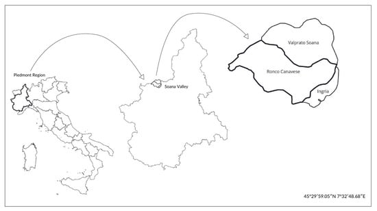 The study was carried out in the Soana Valley, a marginal mountain area in the Piedmont Region in the Northwest of the Italian Alps, which consists of three municipalities—Ingria, Ronco Canavese and Valprato Soana (Figure 1) [42]. The valley’s surface is about 182,870 km2, mostly within the border of the first Italian national park, the Gran Paradiso National Park (GPNP), which covers respectively 71% and 69% of Ronco Canavese’s and Valprato Soana’s areas [44].