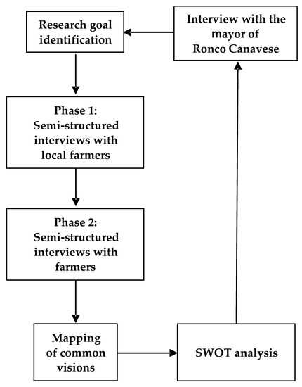 The study was carried out thanks to a set of semi-structured interviews with four farmers [47], coded from A to D. Semi-structured interviews are used in qualitative analysis because this kind of method foresees a predefined set of questions, helping to maintain focus on the research topic while giving both interviewers and interviewees a certain degree of liberty, encouraging communication [48]. Thanks to this method, it is possible to both collect open-ended data and comprehend interviewees’ opinions and viewpoints [44]. This technique can help bypass hesitancy and reticence [49]. However, this kind of method has some limitations. Firstly, it is only able to give a qualitative picture, secondly, it is time-consuming and, lastly, the level of preparation of the interviewer plays a fundamental role in carrying out the study. This is the main reason why for each interview, three interviewers have been involved, i.e., a senior researcher and two junior scholars.