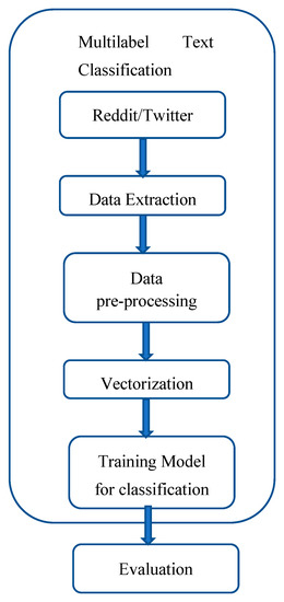 Communication is an essential part of the community, and textual communication is presently one of the most common ways to express ourselves. People utilize social networks to explain their sentiments, mental states, goals, and desires, as well as to document their activities or routines [11]. According to the latest survey reports, more than half of the population (59%) uses social media, and time spent on social media accounts for two-thirds of total internet usage [12]. People often share health information online to gain experience-based knowledge, find emotional support, and work together towards their health objectives. This includes receiving information on specific therapies or behaviors and collaborating on related decisions. Individuals with mental illnesses are more prone to expressing themselves online, whether through blogging, social networking, or public forums [13]. As people write more digitally, an enormous amount of data can be analyzed automatically to infer meaningful information about one’s well-being, such as mental health conditions. Using social data provides an additional advantage in reducing the stigma associated with mental health screening, as such techniques can create new chances for early diagnosis and intervention, as well as fresh insights into the study of the causes and processes of mental health [12,13].