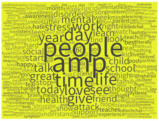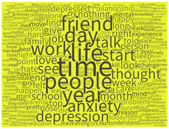 The posts (Twitter and Reddit) consisted of encouragement words (positive sentiment) such as “friend”, “love”, “work”, “Today”, “great”, “time”, “today”, “great”, “life”, “think”, “right” and “life”, whereas negative sentiment words were related to “stress”, “mental”, and “anxiety” (Table 3). Our findings revealed that “time” was a popular topic of conversation, and it was related to “family”, “friend”, and “love”. Individuals may receive comfort and support from social media relationships with family and friends while keeping hopeful that they will soon spend time together. The words “home” and “work” connected with the word “life” were frequently brought up by those who were working from home or unemployed. These results show that most discussions revolved around work-related problems. There was additional talk about “people”, “worry”, and “stress”, suggesting discussions were focused on how to overcome mental illness [54]. The word cloud in Figure 2 represents the frequency of words that occur in the text feature from Reddit users’ post descriptions related to mental illness. The word cloud in Figure 3 represents the frequency of words that occur in the text feature from Twitter users’ post descriptions related to mental illness.