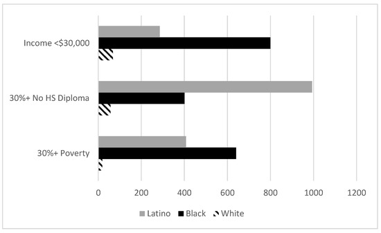 Figure 3 which shows that, while both Blacks and Latinos experience more disadvantage than Whites, Black disadvantage is still much greater than Latino disadvantage. According to these data, the number of counties with a household median income below USD 30,000 for Whites is less than 90. For Latinos, the number of counties that meet that criteria is three times higher, just under 300. For Blacks, that number is nine times higher, or roughly 800. Proponents of the Latino Paradox are surely aware of this, which might explain the hand-waiving qualifiers such as “generally high” or “relatively high” when describing Latino disadvantage, language that masks the stark economic differences between these communities.
