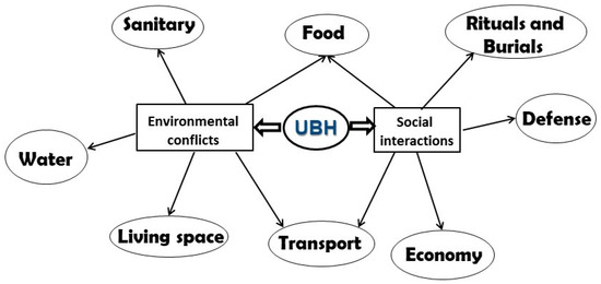 The UBH approach classifies all elements historically built, enlarged or transformed in the underground that, today, can be considered significant assets of local cultural heritage. Regarding their classification, two main groups have been pointed out: the first refers to elements that were used to manage several environmental conflicts, and the second refers to elements built to manage some social interactions. Eight functions are connected to these two main groups: Water, Sanitary and Living Space are included in the first group; Rituals and Burials, Defense and Economy are included in the second; and Food and Transport are included in both of them (Figure 1).