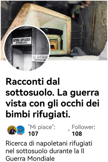 During the third phase, the focus was on the selection of people to be included in the sample. Initially, friends, relatives and colleagues who were in contact with potential candidates were asked for their cooperation, and then managers from the most significant underground cultural routes were contacted to ask them if they knew former refugees. Finally, a call for interviews within a dedicated Facebook page called Racconti dal sottosuolo. La guerra vista con gli occhi dei bimbi rifugiati [34] (Figure 2) was opened. The page stimulated more than 60 responses, which were verified one by one. During this selection, all second-hand testimonies and those of people who did not live in the city of Naples during WWII were excluded. COVID-19 affected this phase of the research. Several proposals could not be finalized because people were very afraid of welcoming strangers into their homes; some participants also died before restrictions ended. The final sample consisted of 23 people.