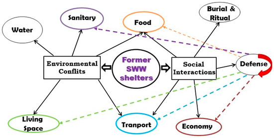 While adopting the theoretical approach of UBH, all WWII Neapolitan shelters can effectively be classified in the Defense function since they were all used by local citizens for their personal safety during the conflict (the violet line in Figure 3).