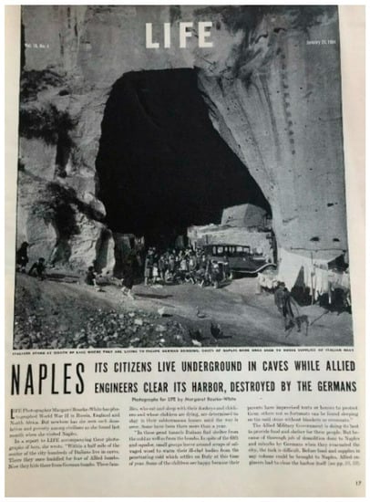 After the end of WWII, shelters were dismissed, but they were very often reused, the new functions were analyzed by adopting the UBH approach again (Figure 4). Firstly, the old shelters continued to be inhabited by those who had lost their homes during the bombings; in this case, the cavities passed from Defense to Living Space (green in Figure 4). This post-war troglodytic lifestyle was brought to light after the publication of a famous special issue of Life magazine [42] (Figure 5), and it turned to be one of the elements with the greatest impact in the media coverage about the conditions of the city of Naples at the end of WWII. When abandoned, many shelters became large landfills for the debris resulting from the collapses; in this case, the cavities passed from Defense to Sanitary (violet in Figure 4). Later, the empty spaces were used as deposits for impounded vehicles, which is another use within the Defense function (the Red U-turn in Figure 4) but also as depots or mechanical workshops, which pass from being classified as Defense to Economy (brown in Figure 4), or as food canteens, which pass from Defense to Food (yellow in Figure 4). After the great boom in private motorization, many cavities were reused as parking lots, passing from Defense to Transport (blue in Figure 4).