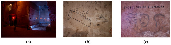 The WWII shelters of Piazza Cavour 140 are today included in the “Museo del Sottosuolo” (underground museum) [43]. This underground route includes the visit to the stone seats created to accommodate refugees and to the wall of graffiti created by people who recovered there during the attacks. Today, the seats are used as spaces for the exposition of art crafts, while the graffiti are illustrated during the onsite visits by the guides (Figure 6).