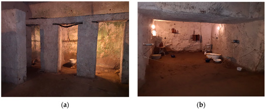 Caves included in Viviani Park are located in a green area, which interconnects the upper side of the city and the city center. The park is one of the most popular recreational areas of the district; it hosts a playground and a dog area. In the webpage from the Municipality of Naples [47], the cavities are described with reference to their first historical use: modern tuff extraction caves. Their reuse as WWII shelters is not mentioned anywhere, and they lay in a state of abandonment; when they were inspected, they were closed to the public (Figure 8a).