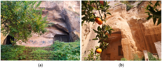 The caves of Via dei Cinesi have been recently included in a recovery plan financed by Fondazione Banco di Napoli, Saint Gobain e Futura Trust and supported by the Neapolitan designer Riccardo Dalisi [48]. Today, they are part of the Orange Garden, a retraining space dedicated to marginalized children and local enterprises in one of the poorest areas of the city. The cavities are closed to the public, and their original historic function, their tuff extraction caves, and their historical reuse as WWII shelters are not mentioned anywhere (Figure 8b).