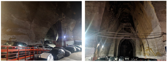 With reference to the third level, a complex of caves located in Corso Vittorio Emanuele, a gateway between the lower and the upper sides of the city, was inspected. Those cavities, born as tuff caves and then used as shelters during WWII, are conveniently located beside several famous hotels, the Cumana Railway station, the Chaia Funicolare’s station and in within a very populated area of the city with a lack of parking facilities. In this perspective, it is not surprising that they have been reused as a parking facility: Parker’s Garage (Figure 9). Today managed by a private firm [49], this efficient parking area offers several facilities dedicated to tourists such as shuttle services, caravan and touristic bus parking, a bike rental, and special prices for groups. Even if Parker’s Garage is one of the most structured and efficient underground parking facilities in the city, there is no evidence of this implementation of the historical caves during WWII.