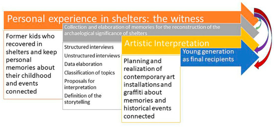 Figure 10 also shows how the research optimizes previous approaches to the adoption of oral history for the implementation of the archaeological value of shelters and their biographies as historical places (green arrow on the right) [3,6] and the adoption of artistic creativity in the interpretation of shelters by children who took shelter during conflicts (violet arrow on the right) [50]. The red arrow shows the passage from the memories of former children to the final recipients in this research.