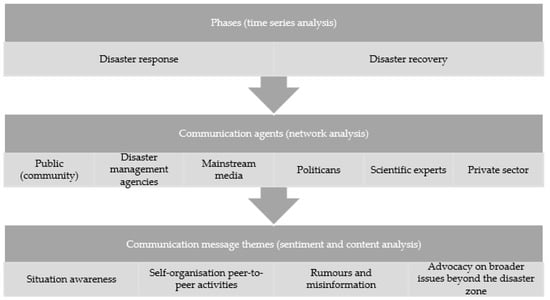 The conceptual model also intends to outline the methodology for this study. It shows that the disaster response and recovery were analyzed using a time series analysis of Twitter posts during and following the disaster. The agents of the communication were then investigated to determine the community sentiment of the messaging. This study extends the risk communication governance agents proposed by [7], suggesting that there are six principal communication agents, including the public (community), disaster management agencies (government), politicians (government), scientific experts, broadcast media and the private sector (i.e., organizations that are not owned or operated by a government). It should be noted that Ogie et al. [32] defined a category of “scientists and experts”; however, this study instead proposes to narrow the definition of this group to scientific experts and, therefore, categorize individuals without scientific qualifications outside of this category. This category includes self-proclaimed experts or citizen journalists [33,34] who used social media to build their reputation as an expert and network following, usually on a niche topic. These experts can gain celebrity-like status from their posting on social media. Accordingly, terms such as Twitter-famous and Instafamous (referring to social media celebrities on Instagram) have emerged [35]. Yet, Enke and Borchers [36] define social influencers as “third-party actors who have established a significant number of relevant relationships with a specific quality to and influence on organizational stakeholders through content production, content distribution, interaction, and personal appearance on the social web” [36] (p. 267). It is, therefore, possible that all categories of agents explored in this study could be potential social influencers. This definition pertains to the final stage of this analysis, which is to understand key themes in the content of the messages and the central influencers in the posting of messages. Based on the literature, four key outcomes are expected to be found in Twitter posts, including (1) gaining situation awareness, (2) self-organizing peer-to-peer activities, (3) providing a source of rumors and misinformation, and (4) serving as a form of advocacy for broader issues beyond the disaster zone, such as climate change, given the increasing public awareness and activism for this issue.