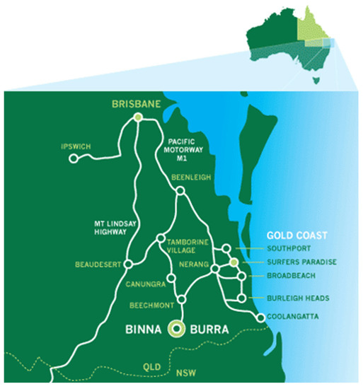 The early-season bushfires destroyed the Binna Burra Lodge (Figure 2) during an event that was deemed catastrophic. This Lodge was a major tourism icon located in the Gold Coast hinterland, Queensland (Australia), and part of the World Heritage-listed Gondwana Rainforests of Eastern Australia. Figure 3 presents a map of the location of Binna Burra Lodge and its proximity to the city of the Gold Coast as well as Brisbane in southeast Queensland, Australia.