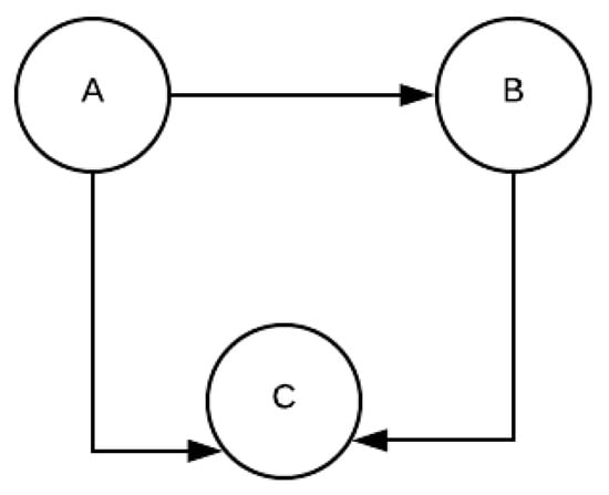 To analyze relationships between users in this conversation network, in this study, we identified specific users using degree centrality (weighted). Degree centrality refers to the number of connections for each node in the network. A node can be defined as any element, and the connections are the lines that links these elements together [51]. For example, in Figure 5, nodes are the circles labeled with the letters A, B, and C, and the connections are the lines and arrows that connect each node. In this work, a node would be any Twitter user who was captured in this conversation, and the connections would be the four relations explained earlier.