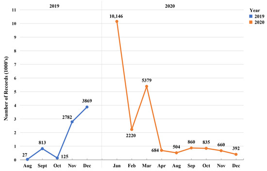 The data collection process was different from using keywords and locations directly. Instead, tweets were collected first by using a bounding box around the Gold Coast (coordinates: 153.158, −28.197, 153.648, −27.776) to find all tweets sent from this region from 2019 to 2020. The next step was to filter the relevant keywords to detect the tweets relevant to this study. Various keywords to filter the tweets were tested, such as “fire” and “wildfire”, but further investigation of the tweet messages revealed that they were not related to the Binna Burra Lodge bushfire event. Only the single keyword “bushfire” was identifying relevant tweets. Since the Binna Burra Lodge bushfire occurred in September 2019, followed by extensive bushfires throughout eastern Australia that burned until March 2020, tweets were collected from August 2019 to December 2020. This way, data collection traced back to August to capture communication on Twitter before, during, and after the event. This resulted in 29,296 tweets.