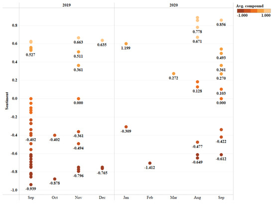 For a better comparison, the sentiment values in this paper were normalized, with “−1 to 0” presenting negative sentiment, “0 to 1” standing for positive, and “0” being considered “neutral”. The VADER only provides sentiment for English tweets, and for text written in other languages, it assigns neutral polarity.