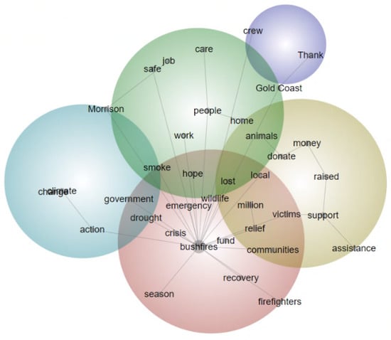 Other sentiments in Theme 3 included concerns about safety, care, hope and loss, with some of these overlapping with the first theme. Focus on specific individuals also emerged in this theme, specifically regarding the Prime Minister of Australia at that time, with the word “Morrison” (which is his surname). The use of this word also overlapped with those used in Theme 4 regarding “Climate Change” aspects. Drought and government actions with regard to climate change also emerged in the discussion. Finally, Theme 5 (shown in the purple circle in Figure 9) relates to the emergency and its impact on the fire crews and how people expressed their reactions during the bushfire.