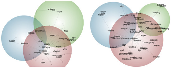 Theme 3 (green circle) displays attention to people, their home, work, job and, like in Theme 2, animals. People expressed strong negative feelings about the threat to their homes and health. For example, one strong negative emotion expressed in the tweet was that the bushfires were affecting one’s respiratory system. This overlap is explained by the preeminent agricultural characteristics of the region and the terrible impact the bushfires had on domestic livestock. This also reflects the discourse in the broadcast media and among scientific experts relating to the impacts of the fires on wildlife [40,41,42].