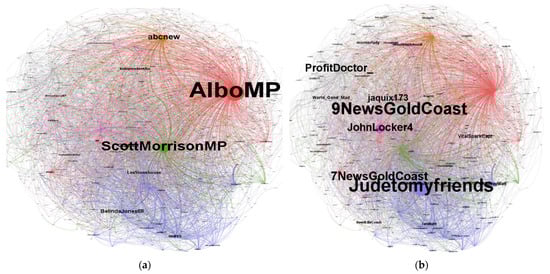 Figure 11 and Table 1 show the members of the network whose posts received attention. Posts that were tagged or retweeted were mostly from news media entities (@canberratime and The Sydney Morning Herald—@smh), with a total of 27 percent of users belonging to the two media communities. Conversely, Figure 11 shows that the most active users who sent out messages from the first two communities were members of the public. A state government official (Queensland (Qld) Labour senator), @MurrayWatt, is the most dominant user in both the in- and out-degree networks, showing that he was very active in the topics as well as in interacting with other users (refer to Figure 11b). To identify the role of social media in disaster response and recovery, the dominant users were correlated with the framework proposed in Figure 3. Table 1 presents the users collected from the four networks to investigate their roles as communication agents.