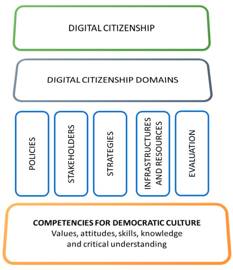 Digital citizenship encompasses a wide range of activities in a constantly evolving digital environment, which means that acquiring the necessary competencies is a lifelong process. The Council of Europe’s foundational competencies for democratic culture provides an overview of the competencies that citizens need to acquire if they are to participate effectively in a culture of democracy [30], and the conceptual model for digital citizenship (Figure 1) builds on this.