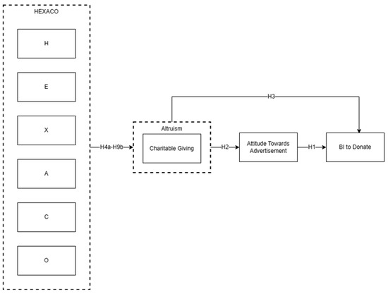 The current study endeavor, driven by the aforementioned theoretical models and contemporary literature, proposes a comprehensive research model that depicts a multifactorial and complex sequence of interconnections integrating notions and concepts such as altruism and personality, but also the way they inspire individuals to charitable deeds and donations. Based on HEXACO’s six-factor model, our approach encompasses elements such as personality traits, the principle of altruism by implementing a charitable giving construct, and attitudes toward charity advertisements. Finally, the dependent variable will consist of the behavioral intention to make future monetary donations. We approach the issue of behavioral intention to donate by studying and including various aspects of the cognitive and psychological human conditions. Personality traits, prosocial behaviors, and philanthropy share similarities in terms of context, assessment, and domain, thus posing a challenge in the survey implementation, which required the careful examination of phrasing in our constructs. The human mind and behavior represent a multifaceted challenge, considering that they are impacted by a variety of external and internal variables such as biological predispositions, culture, age, and so forth [17,18,30,42,60]. In our endeavors, we established a framework that addresses all the beforementioned concepts by defining the components that are essential, the way they are interconnected, and the sequence of interactions that influence the final outcome. We have adapted our constructs in the context of charitable giving and donor behavior, anticipating that the models’ validity will be unaffected despite the adapted context; an assumption that was confirmed by our statistical analysis in Section 3. Figure 1 depicts the proposed research model. The charity donating construct is wrapped in a dotted frame labelled as altruism to denote the close relation of these two concepts (i.e., altruism and charitable giving) in this study.