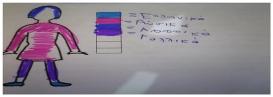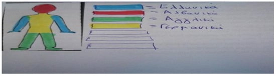 There has been an increasing interest in the field of sociolinguistics in exploring individuals’ multilingual identities through different methodologies, especially in school contexts refs. [9,10,11,12,13,14,15]; a new type of visual representation of student linguistic repertoires that has drawn researchers’ interests has been the so-called language portraits refs. [9,16]. More specifically, language portraits are body silhouettes which make student linguistic repertoires visible through the use of colors that reveal multilingual student experiences, practices, and attitudes towards languages ref. [9]. In fact, colors are considered signifiers and serve as meaning potentials in a given socio-cultural context ref. [17]. Researchers draw a distinction between two different sources for making meaning: association and distinctive features. While distinctive features of colors demonstrate values on a range of scales, such as saturation and darkness, association refers to the source that the particular color derives from, which can be either a certain object or a place, thus indicating a symbolic and emotive value in a given socio-cultural context ref. [17]. In this way, language portraits are seen as alternative ways of expressing multilingual student emotions, practices, and experiences that are linked to each language ref. [16]. In particular, ref. [14] explored twenty-six elementary students’ cultural and linguistic self-portraits, along with their interpretive narratives, in Canada, and they revealed that the students’ self-portraits depicted their cultural and linguistic skills through multiple layers of color and symbols, which highlighted that students connect various languages and cultures with different roles and functions in their lives. Simultaneously, ref. [10] investigated seven young multilingual learners’ identities in Canada through the use of language portraits and found that student linguistic identities were expressed in terms of expertise, affiliation, and inheritance through flags, as well as the symbolic placement of their first languages (L1s) on the body of their language portraits. Ref. [18] investigated the impact of using language portraits on improving teachers’ understanding about their student languages and identities and revealed thematic patterns in relation to identity, culture, and language use that highlighted that their L1s were put on specific body parts of the portraits to indicate intimacy and close connection, while a less emotional connection was found to the second language (L2), which was associated with instrumental uses, such as future academic studying or better job prospects. Refs. [12,13] worked with visual narratives with Portuguese migrant children in Germany, and the visual narratives proved to be a useful tool to gain access to the children’s languages, patterns of experience, and feelings, as well as represent how multilingual minds make sense of the relationship between their linguistic repertoires. Ref. [14] used 570 language portraits and 21 semi-structured interviews to make young students’ multilingual repertoires visible, wherein they revealed that students were aware of their multiple linguistic repertoires; the findings of the study also indicated that, in terms of color choices, there were associations with national flags, their own previous experiences, and personal feelings, while, in terms of language placement, it was shown that languages were structured according to linguistic skills and body parts. Moreover, one of the aims of the study conducted by ref. [19] was to explore young migrants’ linguistic repertoires, and they revealed that they tended to locate their L1s on the central parts of the silhouette, such as the heart or the head, and that the relation between languages and nations through the use of flags was prominent; the findings also indicated that these children had diverse linguistic repertoires, which they tended to separate according to the linguistic domains of school and home, which highlighted the dichotomy between their multilingual realities and the monolingualism in schools, even though often the drawing lines often became hybrid and fluent. In the Greek context, particularly, which the present study focuses on, there was scarce research on mapping multilingual young students’ sociolinguistic profiles through language portraits. For instance, ref. [20] explored both Albanian migrant mothers’ and their children’s attitudes to multilingualism through narratives and language portraits that revealed that children’s specific color choices were based on flags and world experience, while color placement on parts of the body depended on their functions (e.g., in their hands when they often use the language), thus highlighting the children’s overall perception of multilingualism as a qualification or skill ref. [12]. Another study ref. [21] investigated an unaccompanied minor’s linguistic repertoires and ideologies by using a language portrait that indicted that specific parts of the body were chosen for specific languages; for example, the L1 was placed on his face, while the L2 was placed on lower parts of the body.