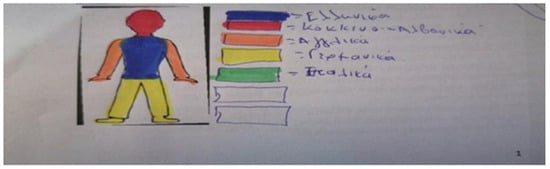 Language portraits, one form of graphic visualization, consist of the outline of a body silhouette, which participants have to color to represent their linguistic repertoires symbolically. As visual representations, they allow participants to present their linguistic repertoires through other semiotic modes, such as the visual or through color to communicate meaning in a given socio-cultural context ref. [17]. The use of language portraits as a research method was popularized by Busch ref. [23], who used them in multilingual schools in Austria and South Africa. In fact, they turned out to be powerful tools that represent multilingual people’s lived language experiences, practices, and trajectories, as well as provide a way for teachers to access and understand their students’ multilingual realities without restricting them to focus on a specific language refs. [7,14,16].The silhouette usually creates body-related metaphors, such as “x language is in my heart”, thus indicating certain feelings and functions; for example, the L1s are usually put on central body parts that express feelings of intimacy, while languages put on peripheral body parts demonstrate fewer identifications ref. [19]. However, most researchers working with language portraits recognize the limitations of this research tool and, therefore, they use a multi-modal approach to data collection by either interviewing participants or asking them for a written/oral description of their language repertoire refs. [12,13,16]. According to ref. [23], when visual representations are accompanied by interviews or narratives, they give researchers an overview of how participants conceive of and depict their linguistic repertoires and experiences. In this way, language portraits cannot be analyzed independently of each speaker’s descriptions and explanations, but are used as a starting point for interviews or narratives. For this reason, we also used a multi-modal approach to our research, that is, language portraits were accompanied by the participants’ interviews. Namely, after students having finished coloring the silhouettes the way they wanted while thinking about their languages, the interviews were conducted. In terms of the language portraits, it should be clarified that the colors used to depict the languages spoken were the student’s choice.