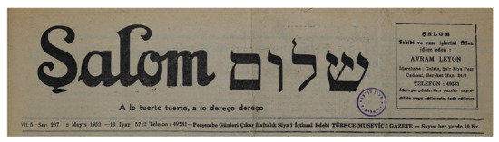 Between 1947 and 1984, Şalom continued to appear in Ladino, even when this ethnic language came under attack by the Kemalist establishment due to its aspiration to homogenize Turkish society ([40], pp. 255–261). This de facto rendered the Ladino used by Şalom an undesirable “reminder” of the existence of a separatist communitarian ethnicity that was maintained by means of language, religion, and culture within a parochial melting-pot national discourse that sought to obliterate the Jewish communitarian identity and subordinate it totally to the majority culture. By virtue of its very existence and much like the migrants’ press that evolved in Israel and elsewhere, Şalom attested to a dynamic of ethnocultural resistance to the cultural framework dictated by the nation-state.