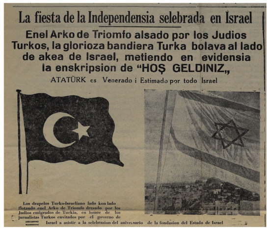 In the diplomatic and cultural contexts, the editors of Şalom shared with their Turkish-Jewish readers their sense of pride at the sight of the Turkish flag on the occasion of Israel’s fourth Independence Day (1952). Under a picture of the Turkish colors intertwined with those of Israel and the caption “Welcome” in Turkish (Hoş Geldiniz) in an exceptionally bold font, the editors wrote: “In the arch of triumph erected for the Turkish Jews, the glorious Turkish flag waves next to that of Israel, as evidence to the inscription of ‘HOŞ GELDINIZ’”. They added that “ATATÜRK, the founder of the Republic, is revered and esteemed throughout all of Israel” (see Figure 2).