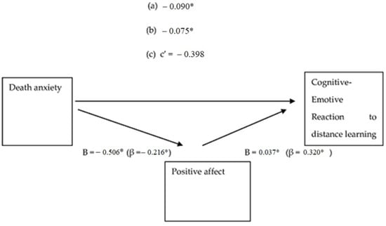 To examine the potential mediating effect of the positive and negative affect between death anxiety and cognitive–emotive reaction to distance learning, a series of linear regression analyses were performed.