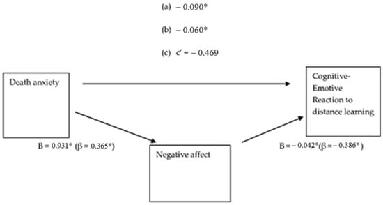 In the second tested mediation model, only negative affect was the mediator (Figure 2). These regressions showed as death anxiety was significantly associated with negative affect (B = 0.931; β = 0.365; R Square = 0.134; F = 65.808; t = 8.112, p < 0.001) and cognitive–emotive reaction to distance learning (B = −0.090; β = −0.329; R Square = 0.108; F = 51.737; t = −7.193, p < 0.001). In the last equation, when the β coefficient of negative affect was included in the model, the relationship between death anxiety and cognitive–emotive reaction to distance decreased (B = −0.060; β = −0.217; R Square = 0.190; F = 49.751; t = −4.627, p < 0.001), although it was statistically significant. The Sobel test (−5.829, p < 0.001) showed a partial mediation. Therefore, negative affect mediated partially the relationship between death anxiety and cognitive–emotive reaction to distance learning.