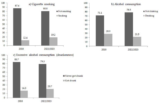 Figure 1 reveals that cigarette smoking increased from 12.4% in 2018 to 19.2% in 2022/2023. The share of students who frequently drink alcohol decreased from 28.9% in 2018 to 21.5% at the end of the pandemic. The excessive alcohol use (drunkenness) increased from 16.3% to 20.7%. There are no comparable data on the prevalence of vaping during the pre-pandemic period but data from European School Survey Project on Alcohol and Other Drugs (ESPAD) conducted in 2019 show that 13.4% of the young people aged 15–16 currently use e-cigarettes. In 2022/2023, the percentage of vapers in this age group was 32.1% although the survey data are not fully comparable [].