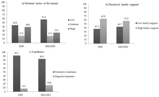 The material status of the family, perceived family support and loneliness among Bulgarian adolescents in 2018 and 2022/2023 (%). The first panel (a) compares the material status of the family estimated from HBSC-2018 and the survey on adolescent health and well-being in the context of the COVID-19 pandemic (2022/2023). The second panel (b) compares perceived family support estimated from HBSC-2018 and the survey on adolescent health and well-being in the context of the COVID-19 pandemic (2022/2023). The third panel (c) compares loneliness estimated from HBSC-2018 and the survey on adolescent health and well-being in the context of the COVID-19 pandemic (2022/2023). HBSC-2018 includes a measure of loneliness that differs from the measure used in the survey on adolescent health and well-being in the context of the COVID-19 pandemic (2022/2023).