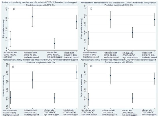 The results reveal that the probabilities of cigarette smoking and alcohol misuse are highest among students from low support families who did not experience COVID-19 infection in the family (Figure 3a,d). The probability of vaping is highest in both groups of students from low support families, with and without experience of COVID-19 infection in the family (Figure 3b). The predicted probability of alcohol use is highest among students from low support families who experienced COVID-19 infection in the family Figure 3c).