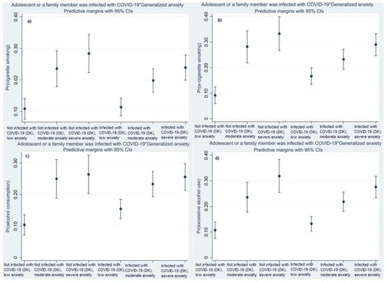 The predicted probabilities of cigarette smoking, vaping and alcohol misuse are highest among students with severe anxiety symptoms who did not experience COVID-19 infection in the family (Figure 4a,b,d). The predicted probability of alcohol consumption is highest in both groups of students with severe anxiety symptoms, with and without experience COVID-19 infection in the family (Figure 4c).
