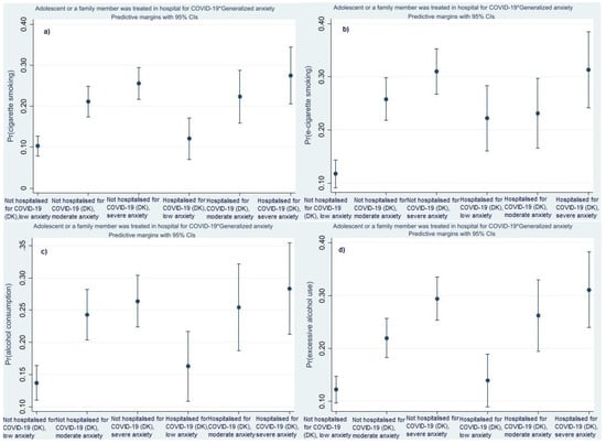 The predicted probability of cigarette smoking, alcohol consumption and drunkenness are highest in the group of students with severe anxiety symptoms who have experience with hospitalisation for COVID-19 (Figure 5a,c,d). The predicted probability of vaping is highest in both groups of students with severe anxiety symptoms, with and without experience of hospitalisation for COVID-19 including treatment in hospital of a family member (Figure 5b).