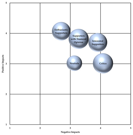 Based on the analysis of the repetition of certain patterns in existing studies, Ramón and Serra [11] proposed the existence of five groups of residents whose weight in society will depend on the specific destination being analyzed: enthusiastic supporters, supporters with nuanced opinions, interested supporters, critics, and those without a formed opinion. Even so, Ramón and Serra [11] indicate that the five groups do not always have to appear.