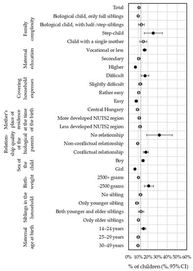 Based on SDQ, 24.0% of children have socio-emotional difficulties. Compared to the total sample, a significantly higher proportion of the children have socio-emotional difficulties if they are not only living with biological siblings (30.0%), are step-children (35.8%), or are living with a single mother (40.1%) (Figure 2). The children of mothers who have only primary education (41%), who can cover the household expenses only with difficulty (45.5%), who are living in a less-developed NUTS2 region of Hungary (32.1%), and who have a conflictual relationship with the cohort child’s biological father (37.4%) are also at higher risk of having socio-emotional difficulties.